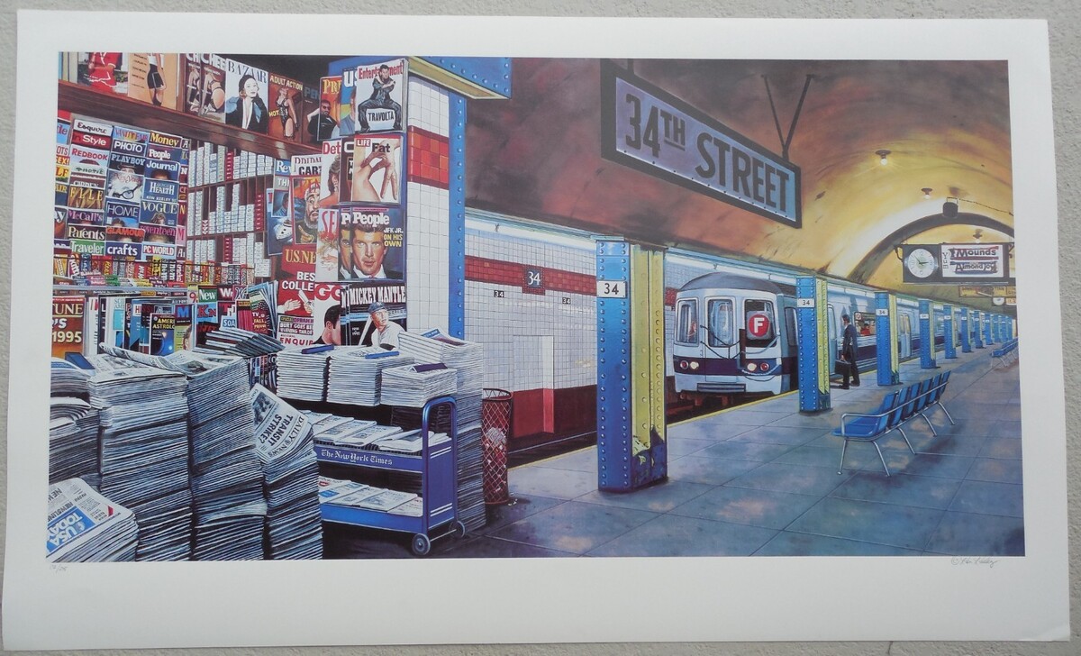The art is a large hand signed and numbered serigraph by artist Ken Keeley, titled "34th Street." Produced in 1995 in New York, USA, this vintage realist artwork features a landscape orientation and multi-color palette. The unframed piece measures 30 inches in height and 50 inches in width, making it a limited edition original print perfect for collectors interested in American culture and magazines themes. The image size is 24" x 46". I will pack, ship and insure this great piece at my expense. Thank you!