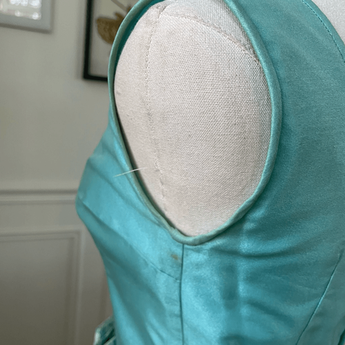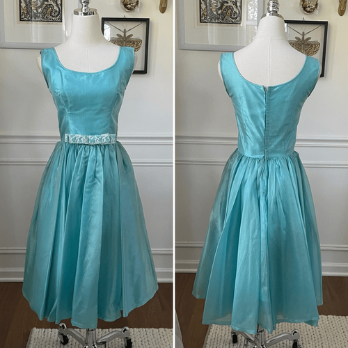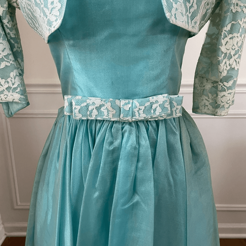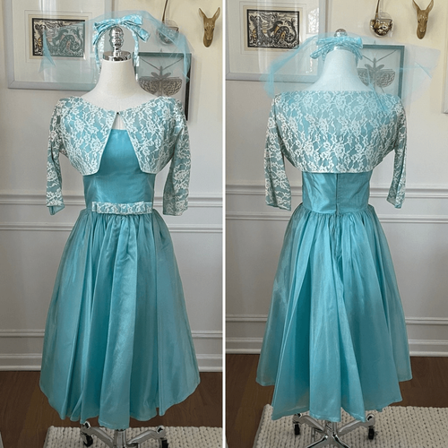 Vintage 60s three-piece special occasion, dress set, including fit and flare dress, lace shrug, and coordinating headband with veil. No tags, Tiffany blue starched acetate fit and flare sleeveless dress with double layered full skirt and back zip closure. There is an ivory lace bow front and center at the waist. It includes a very cropped lace half sleeve shrug in ivory and a matching headband with turquoise blue tulle ?veil?. There is some discoloration near the arm holes that would not be visible with the shrug and a dusty kind of discoloration near where the skirt gathers at the waist. See photos. I believe both could be remedied by a professional cleaning which I do recommend. It?s still very wearable regardless and so fun to find the set altogether. Laying a lot measures approximately 40? shoulder to hem, 12? straight across the waist and 16? armpit to armpit. the shrug measures 11? shoulder to ham and 20? armpit to armpit with the top hook fastened. The lace headband has a bow on it and the short veil makes me think that this was for a special church occasion, but there are lots of ways you could mix and match this set. Based on the measurements, I am marking this as a modern extra small, but please double check to ensure the proper fit for you.