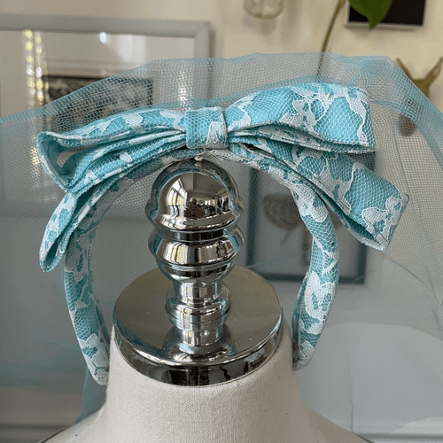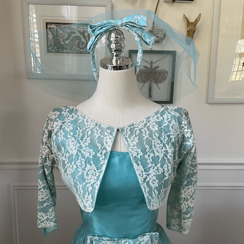 Vintage 60s Turquoise Blue Ivory Lace Fit & Flare Dress Shrug Headband Veil XS