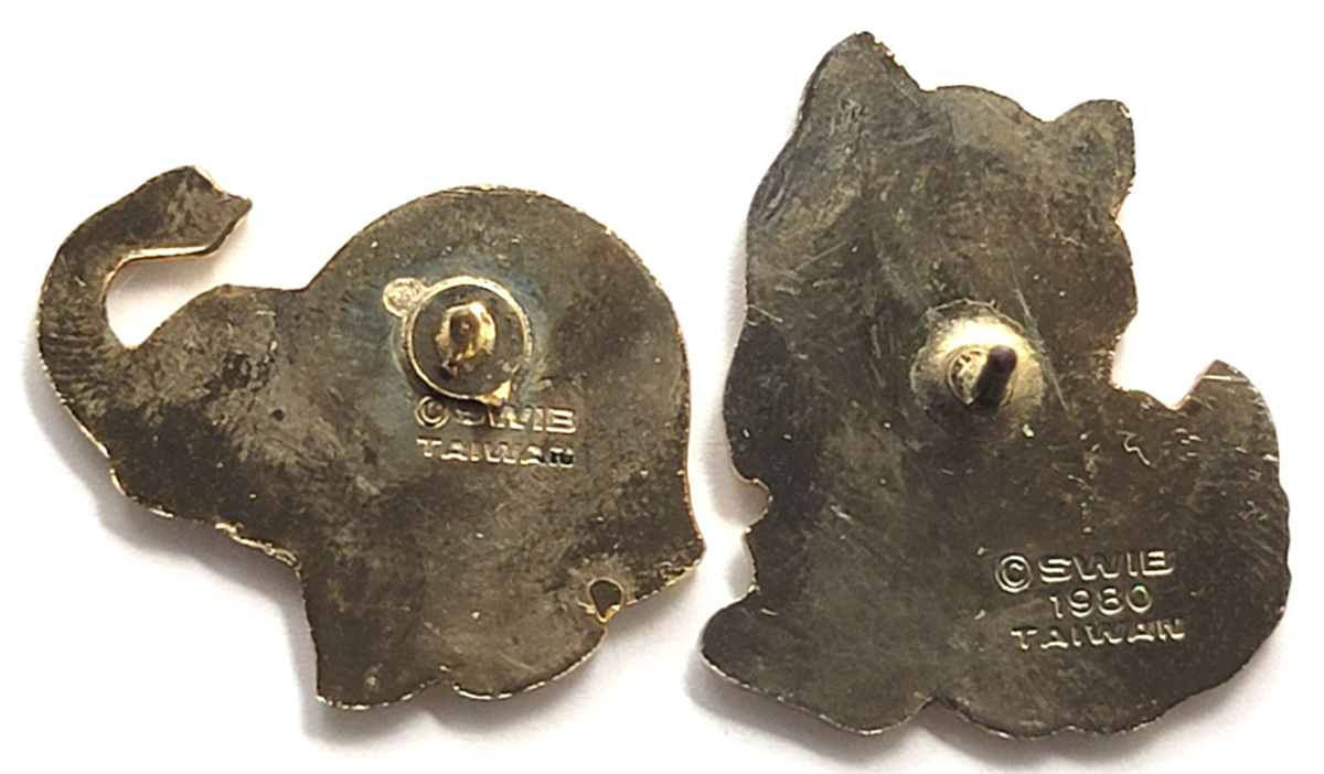 Vintage Elephant Cat SWIB Taiwan Enamel Pin Lot 2 Cartoon Animal Trunk Kitty Bow