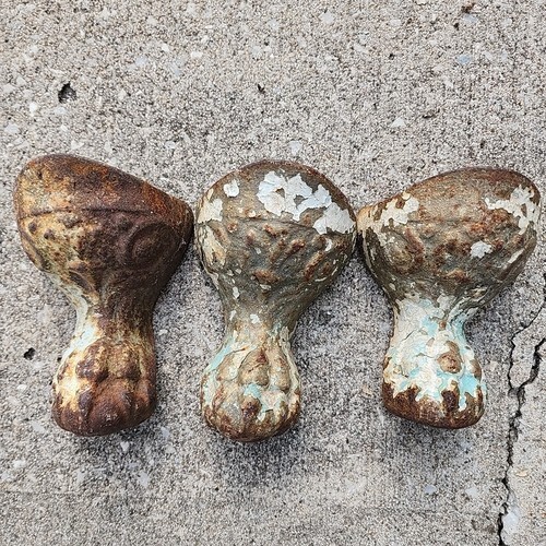 Up for sale is a used Set of 4 Architectural Salvage Cast Iron Tub Claw Ball Feet that was painted Red and White flaking paint that measures 6 Inches tall.