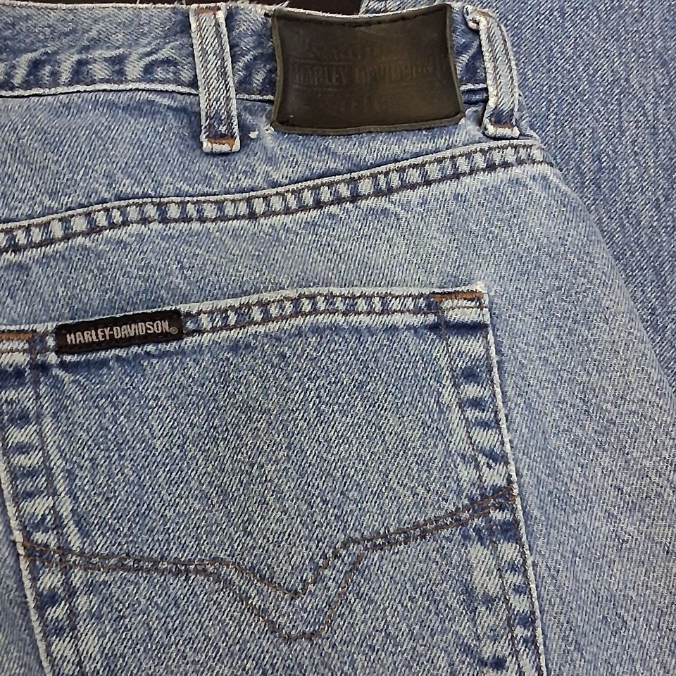 These Vintage Harley Davidson Jeans are a rare find from the 1990s with a light stonewash and distressed look, giving them a unique and retro appeal. The 39" waist and 34 1/2" inseam provide a comfortable fit for any Harley Davidson enthusiast looking for a stylish and nostalgic addition to their wardrobe. Perfect for those who appreciate the brand's iconic style and heritage. Length is 46" Rise 13 1/2"