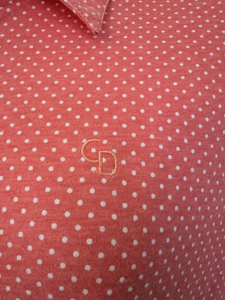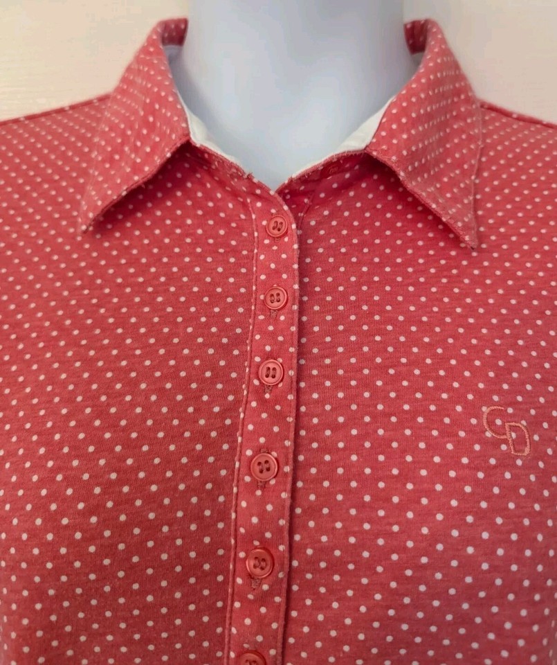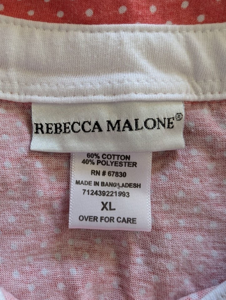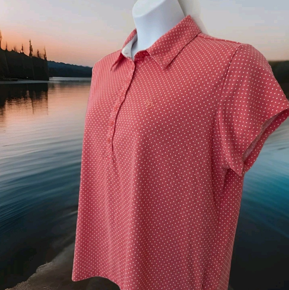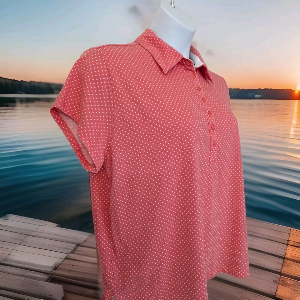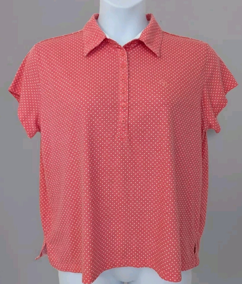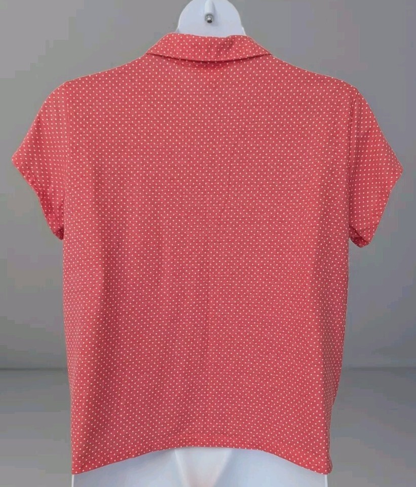 Rebecca Malone Polo Womens XL Pink White Polka Dot Collared Short Sleeve Top. Condition is Pre-owned. Shipped with USPS Ground Advantage.