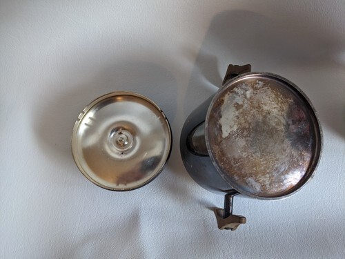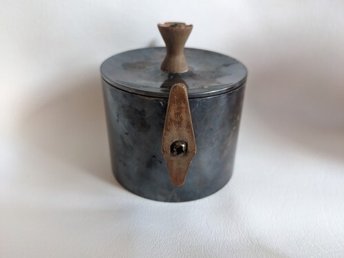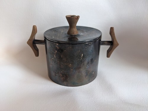 Up for sale is a used Danish Modern Sugar Bowl Silverplate Teak Wood Mid Century Modern Signed B B. Lid has a chipped handle.