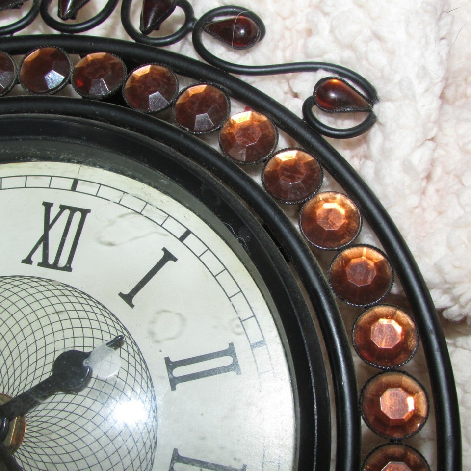 CLOCK battery black metal yellow-orange rhinestones wall or table (B)