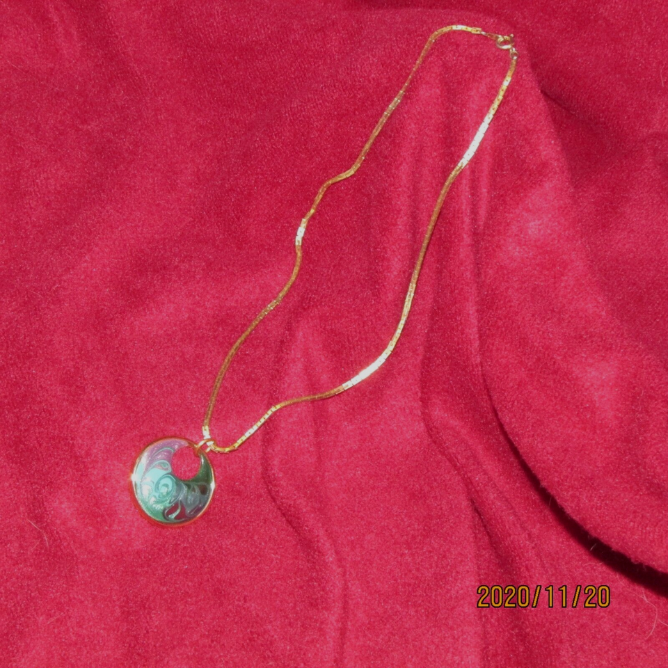 necklace w/1" round pendant blue marbleized insert w/gold color chain (jewel 53)