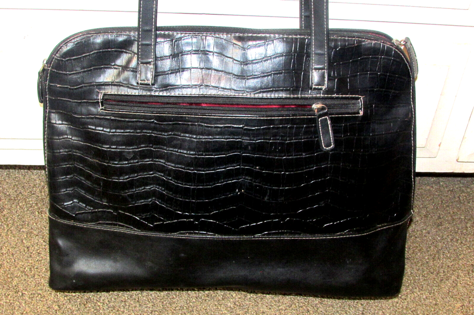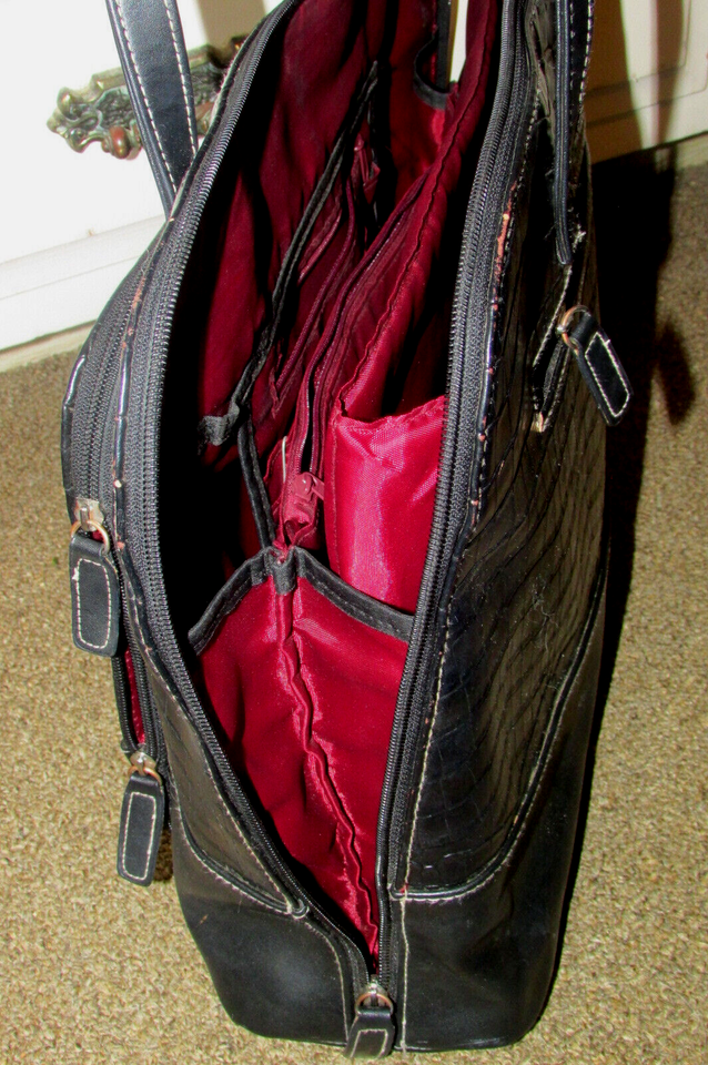 MERONA large PURSE HANDBAG faux leather black 17x12x5" nylon burgandy inside