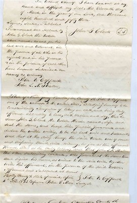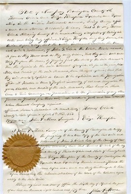 A 4 page hand written document with ribbon biding, John G Clark Hand Written Sealed Will . Dated 1853 in Burlington County New Jersey . Nice large Seal and interesting signatures. Pages measure about 7 5/8" x 12 1/4". Is now. Folded.