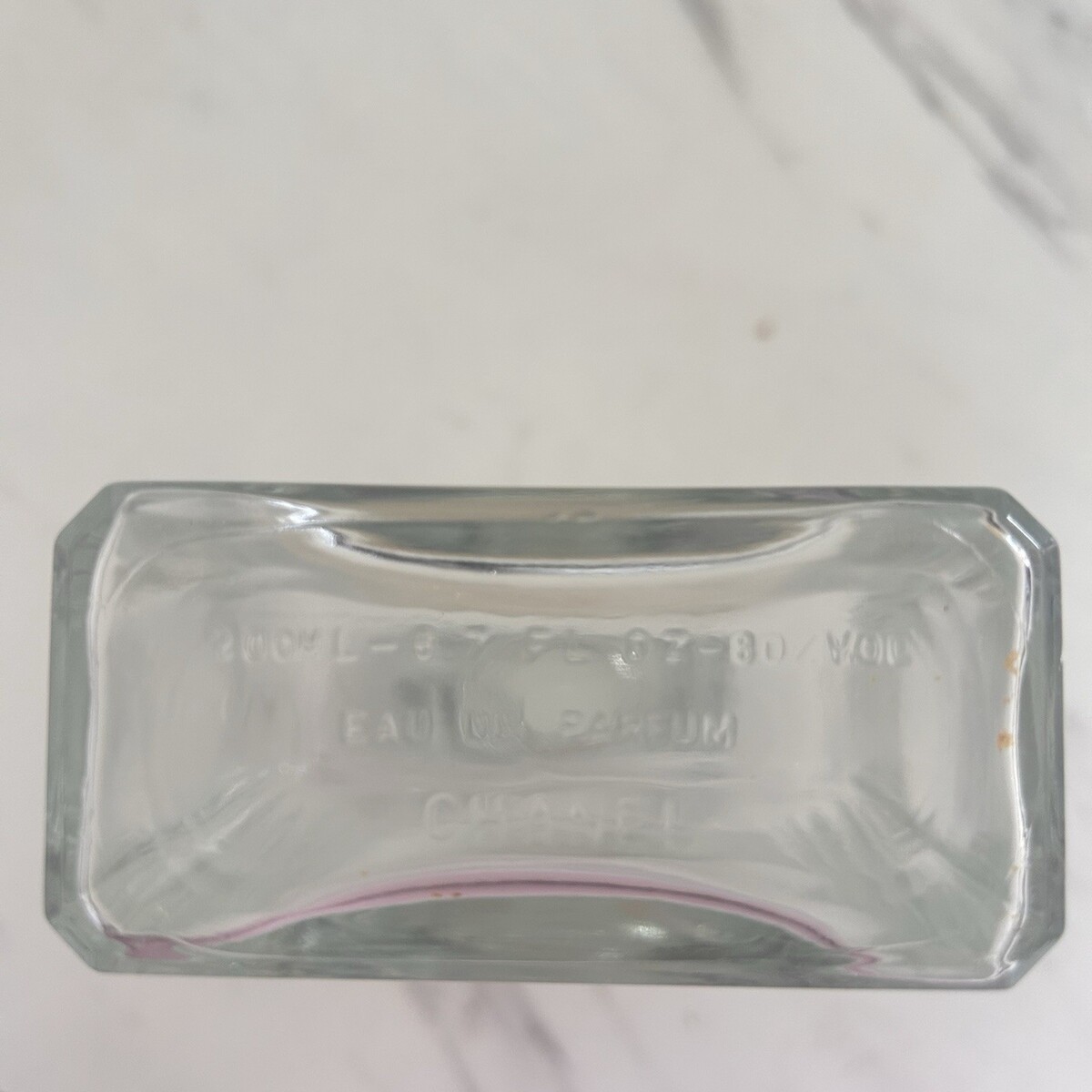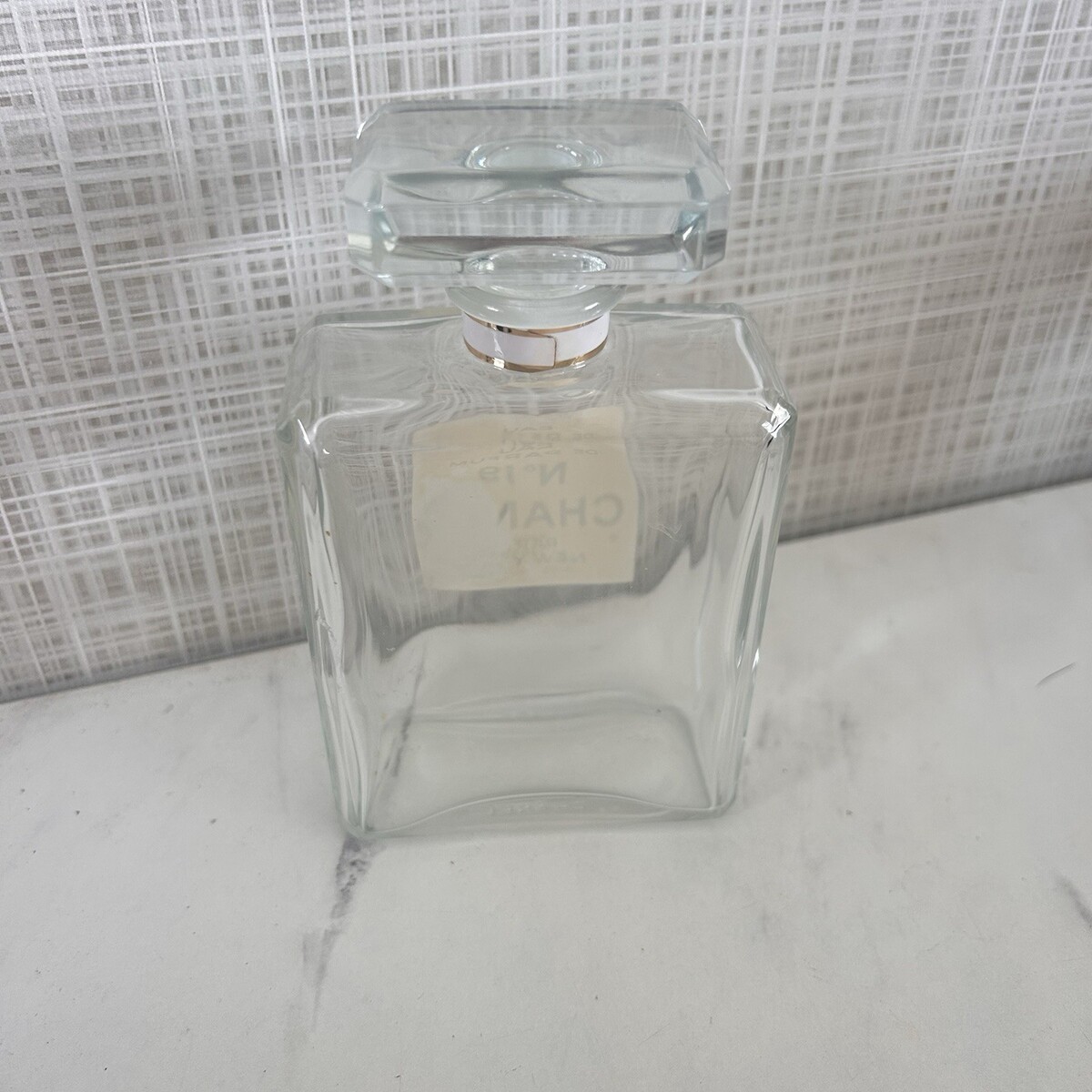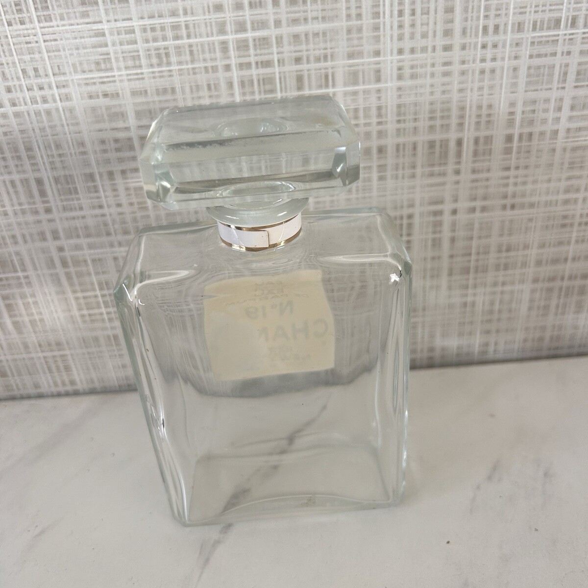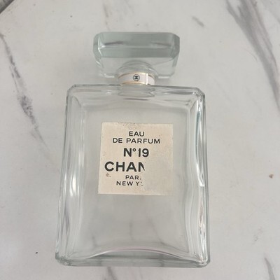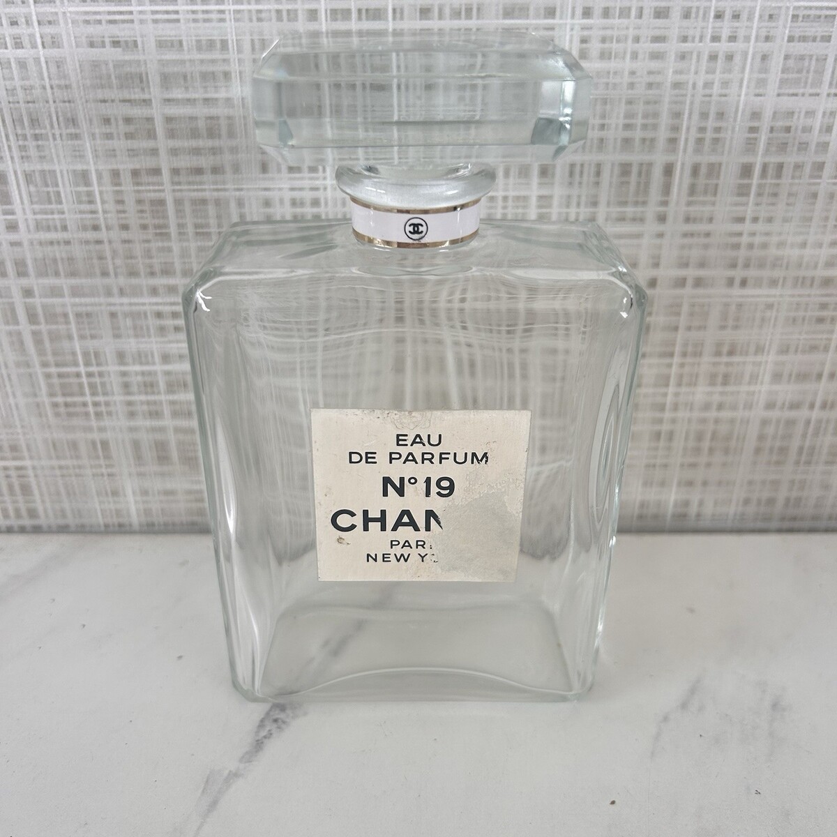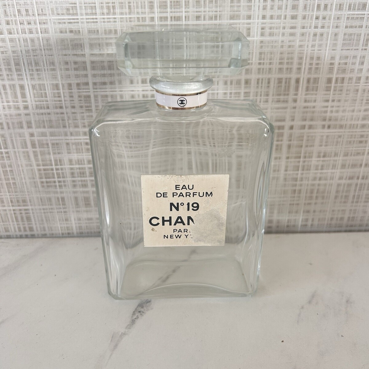 Eau De Parfum No 19 Chanel bottle with stopper. 6.7 ounces, 5.25' tall by 3" wide. Pre-owned very good condition except for partial label is missing. Large and heavy. There is no perfume smell from bottle so I don't know if this was actually a store display or not. The label does not have "factice" on the back of the label or on the bottle. I couldn't find any on any sites that are this large.