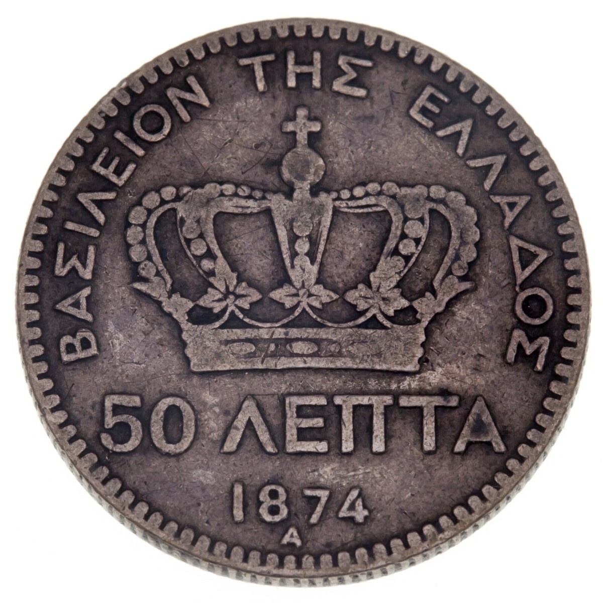 1874 Greece 50 Lepta Coin in VF Condition KM #37
