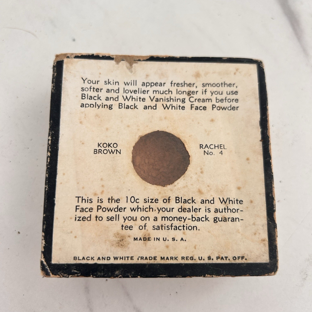 Vintage Face Powder Genuine Black and White Co Plough Inc USA Square Paper Box. Box has not been emptied - there is some powder still in box. Pre-owned. Box is in acceptable condition with some wear. Please see photos. Cardboard box.