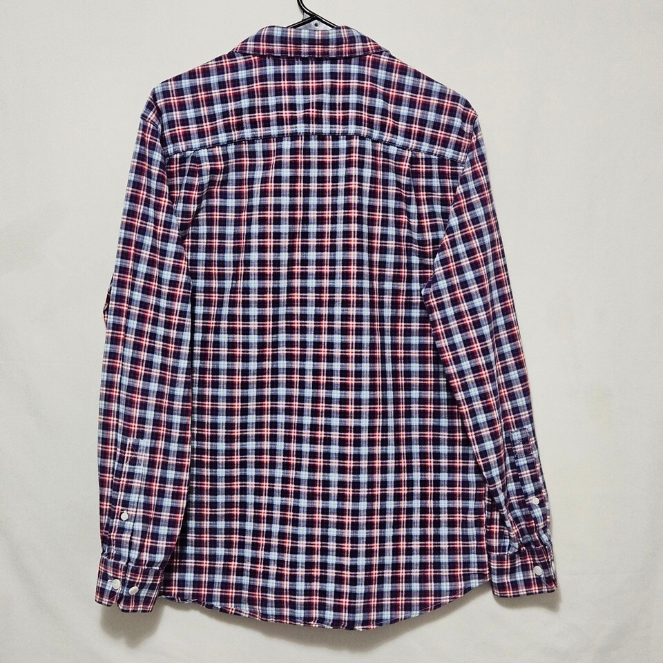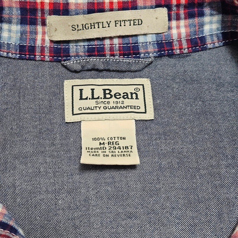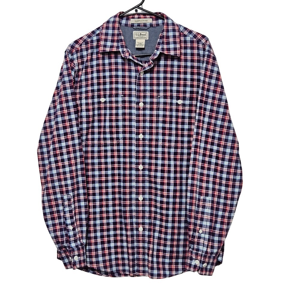 LL Bean Slightly Fitted Flannel Longsleeve MREG Plaid Red Navy Blue 100% Cotton