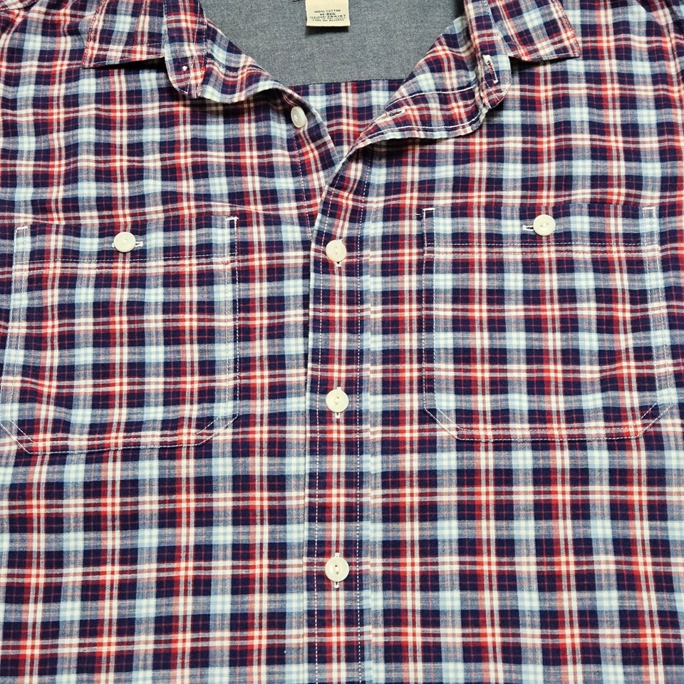 Cozy and rugged, this is a classic L.L.Bean long-sleeve flannel shirt in a striking red, navy blue, and white plaid pattern. Known for their quality and durability, this 100% cotton flannel is perfect for layering, outdoor activities, or casual everyday wear.