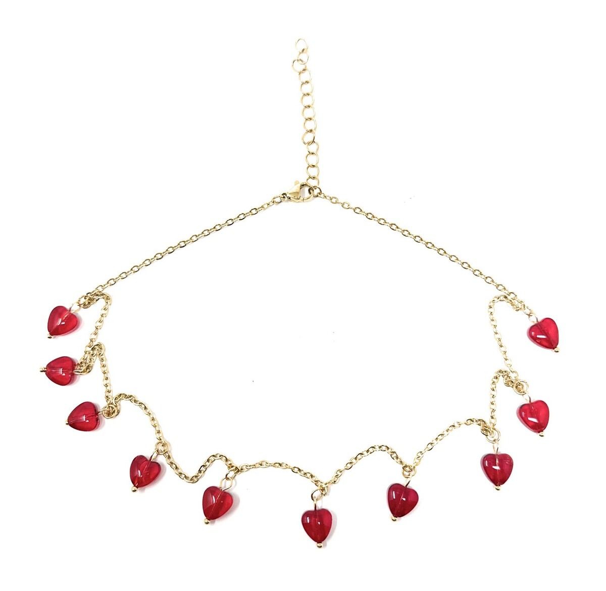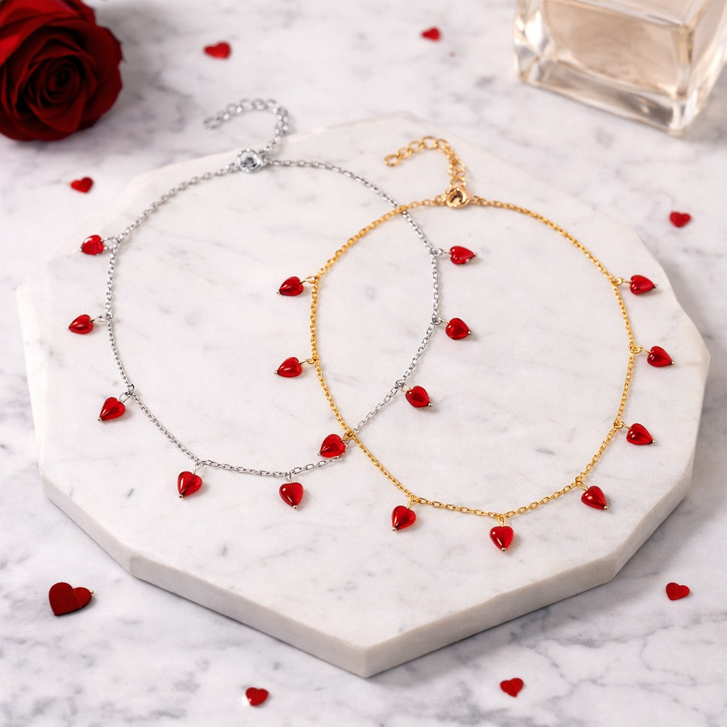 Featuring multiple glossy red hearts spaced along a delicate gold or silver tone chain, this piece is designed to be feminine, elegant, and easy to wear every day.