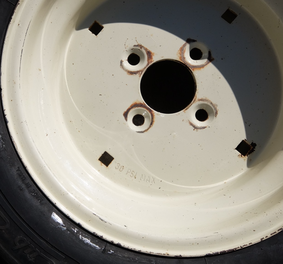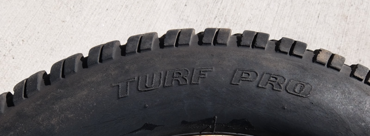 This is a used rear wheel and tire assembly that was removed from the tractor below. The tire is Cub Cadet brand and is 23x9.50-12. It has about 60% tread. The wheel is a 4-lug rim shows some peeled paint and light rust as shown. The tire shows some light cracking as shown. The tire has an inner tube in it and seems to hold air fine.
