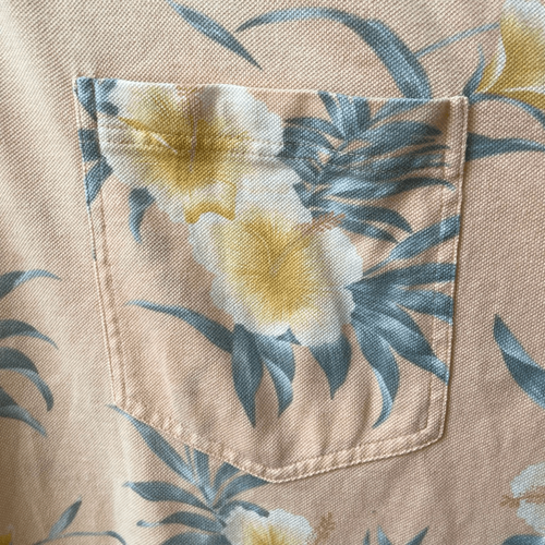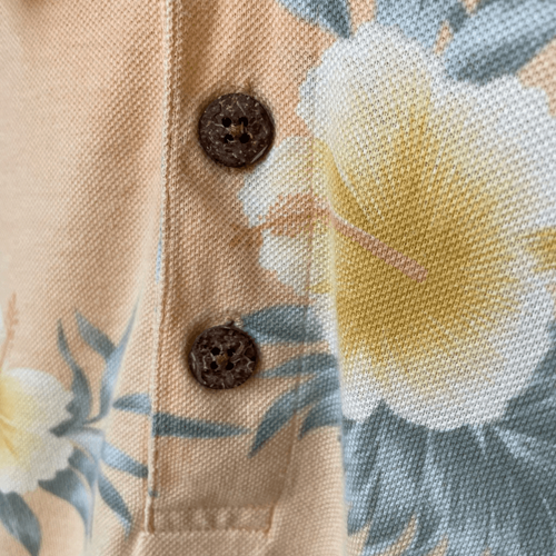 Vintage Tommy, Bahama, 100% cotton, tropical hibiscus, flower, print polo golf shirt with coconut buttons. Soft peach, backgrounds with yellow and green. Brand patch at the helm. Laying flat measures approximately 31 inches shoulder to hem and 23.5 inches armpit to armpit.