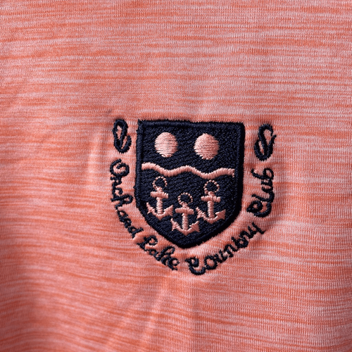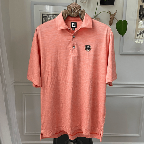 FootJoy polyester and spandex blend polo or golf shirt in orange Heather with dark blue embroidered orchard Lake country club logo at the chest. Orchard Lake country club is an exclusive and historic country club in the metro Detroit area. In my opinion, sizing is generous on the shirt so please double check measurements to ensure the proper fit for you: 30 inches shoulder to hem and 24 inches armpit to armpit.