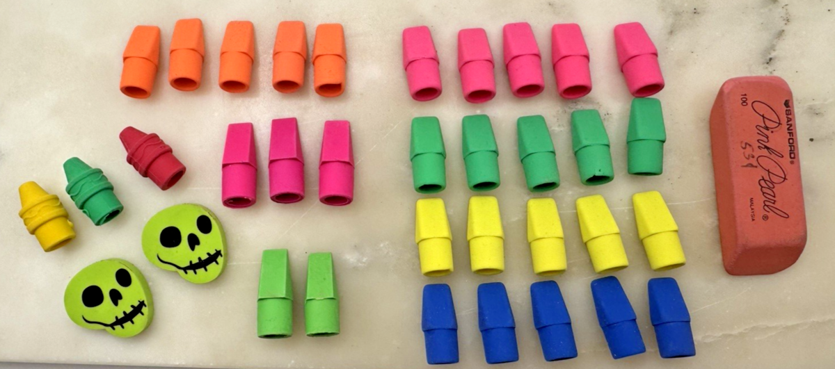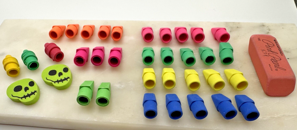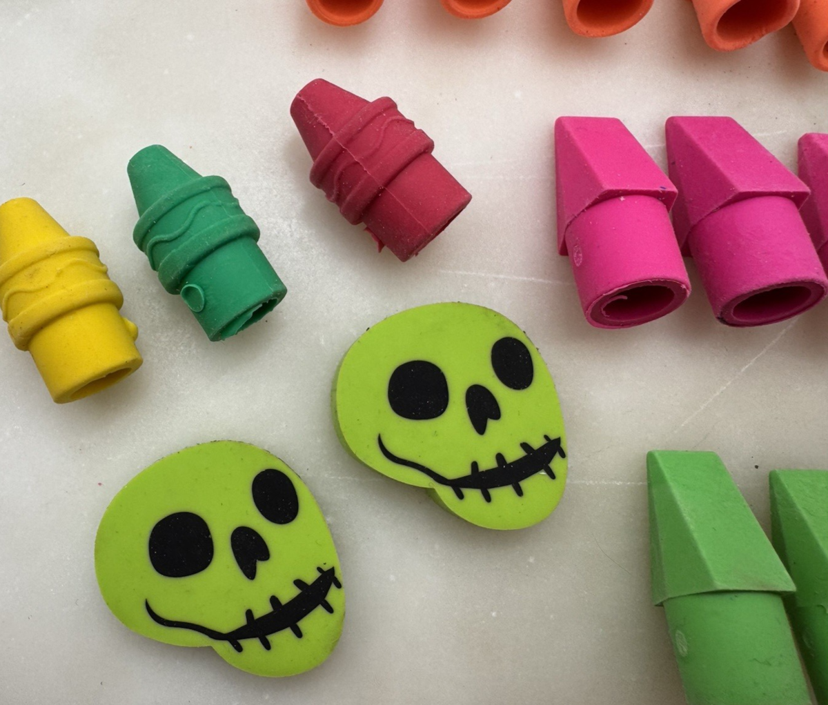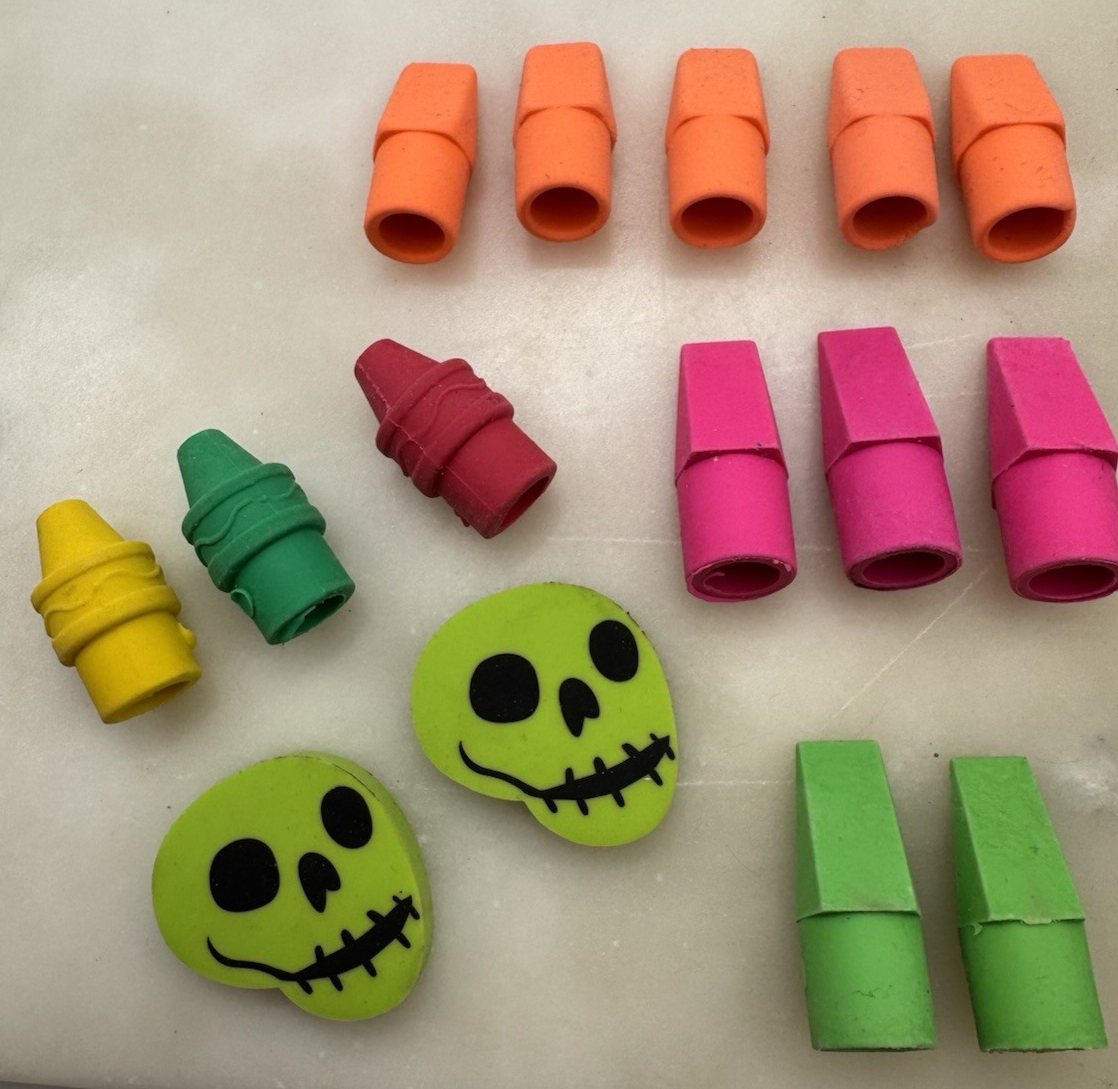 Mixed lot of colorful pencil top erasers and novelty erasers including bright neon pencil cap erasers, crayon-shaped erasers, two skull novelty erasers, and a Sanford Pink Pearl block eraser. This fun assortment is perfect for classroom reward boxes, teacher supplies, homeschool activities, party favors, or desk accessories. The variety of colors and playful shapes make this a great grab bag lot for students, teachers, or collectors of novelty school supplies.