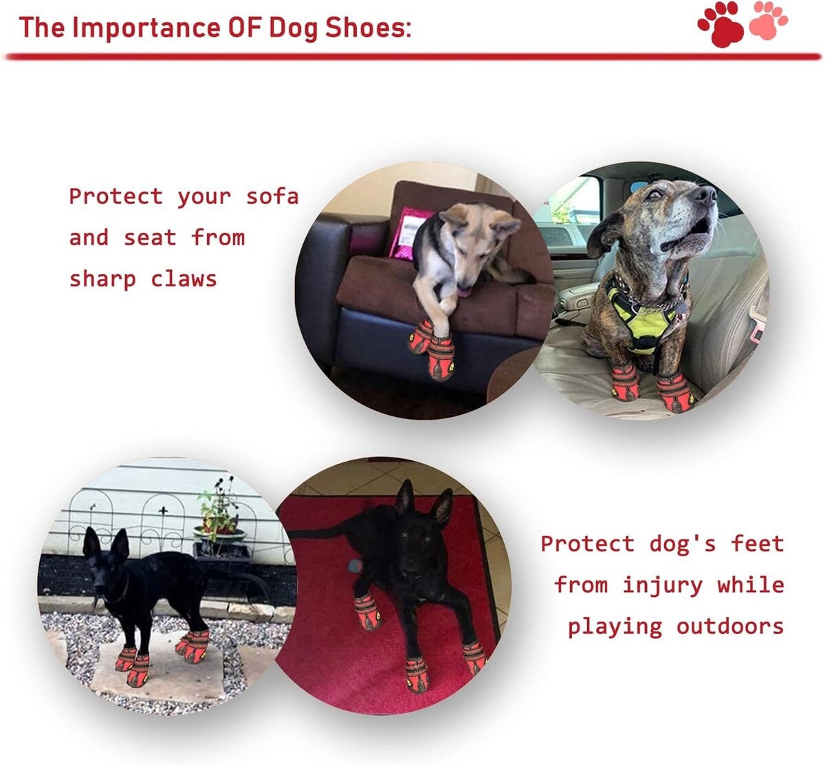Features: Waterproof,Reflective Strips,Rugged Anti-Slip Sole,Skid-Proof,Breathable,Adjustable Straps,Hand Washable,Wear Resistant,Long-lasting soles,Soft and Comfortable,Mobility Assistance,Protection from Sharp Thorns,Protection from Hot Pavement,Protection from Snow and Ice,Prevention of Carpet Scratches,Prevention of Paws from Dirt,Enhances Visibility at Night
