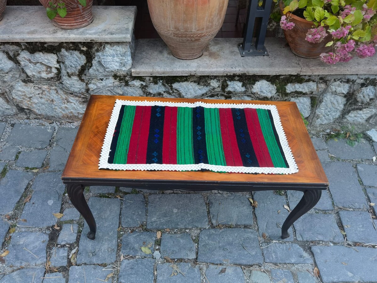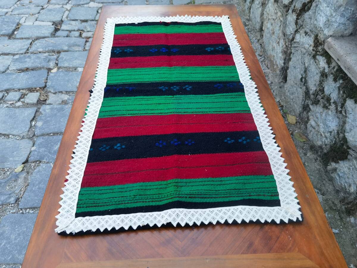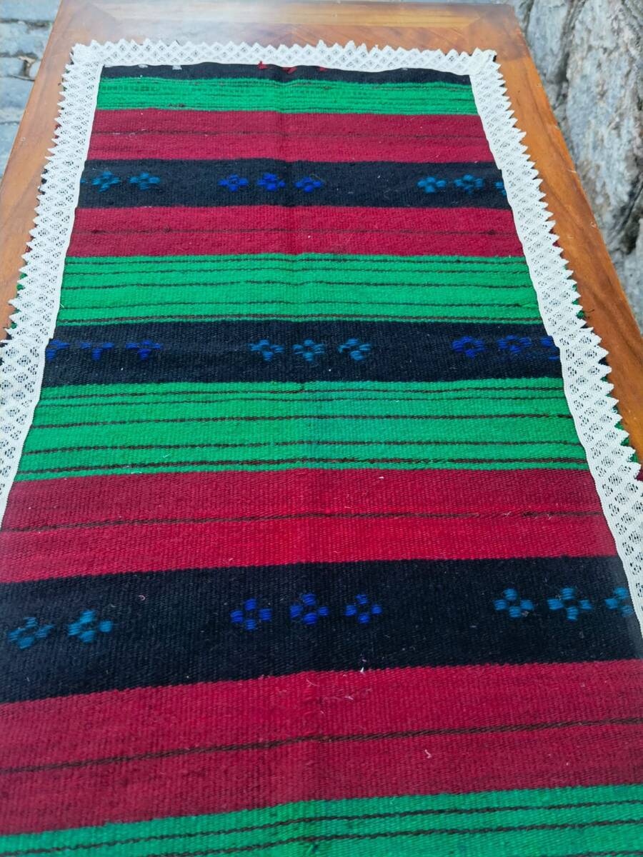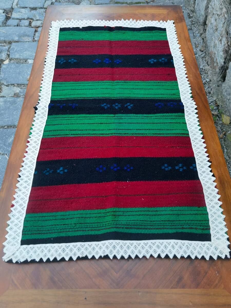 This is a beautiful table runner, lovely piece of antique linen handmade in the middle of the first half of XX century (20's-30's). The table runner is hand woven on a loom, made of natural pure wool and decorated with lace on all of the four sides. Its simple pattern and timeless design makes it easy to fit it in every home decor and interior. Can be placed in the center of the dining table, on a coffee table, end table or it can be used as a place mat or a doormat.