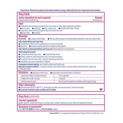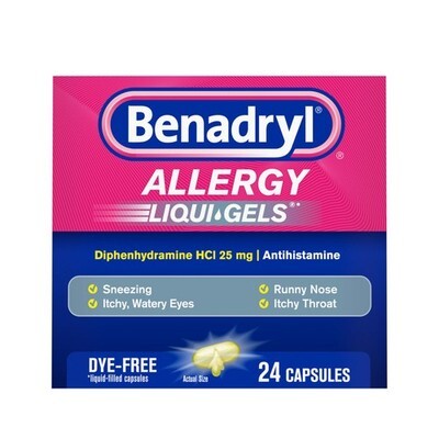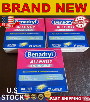3 Boxes Expiration date of 10/2026 ? ALLERGY RELIEF MEDICATION: 24-count package of Benadryl Dye-Free Allergy Relief Liquid Gels to help alleviate symptoms associated with allergies such as sneezing, runny nose, itchy throat or nose, and itchy, watery eyes ? POWERFUL ANTIHISTAMINE: This allergy medicine temporarily provides relief of hay fever and other upper respiratory symptoms such as sneezing and runny nose. It also provides relief from common allergens such as tree pollen, dust, mold and pet dander ? COLD SYMPTOM RELIEF: The antihistamine tablets with diphenhydramine hydrochloride feature an effective and powerful formula that works when you need it most. The tablets for multi-symptom relief help tackle both cold and allergy symptoms ? DYE-FREE DIPHENHYDRAMINE HCl FORMULA: Made with a dye free formula, Benadryl allergy medicine contains 25 mg diphenhydramine hydrochloride, an antihistamine that works to help provide allergy and upper respiratory relief ? POWERFUL ALLERGY COLD SYMPTOM RELIEF IN JUST 1 PILL: Adults children 12+, take 1 to 2 allergy liquid gels every 4 to 6 hours. Children ages 6-12, take 1 allergy medicine tablet every 4 to 6 hours. Do not give more than 6 doses in 24 hours