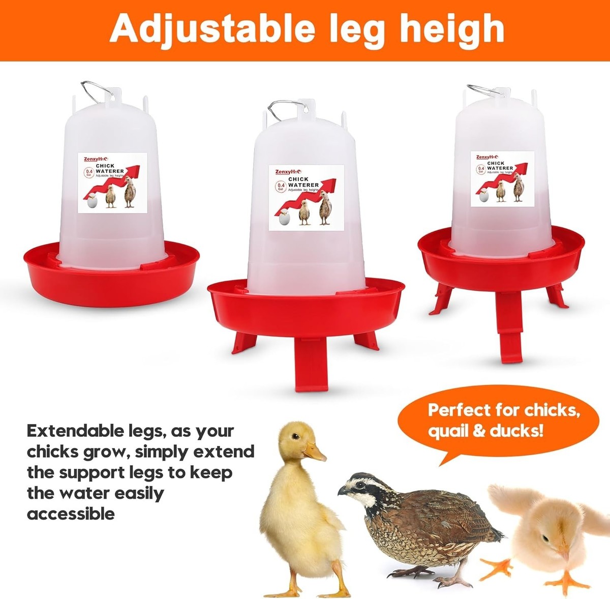 Adjustable Height for Growing Chicks: The 0.4-gallon waterer features 3 adjustable height settings. It grows with your chicks for optimal access at every stage.