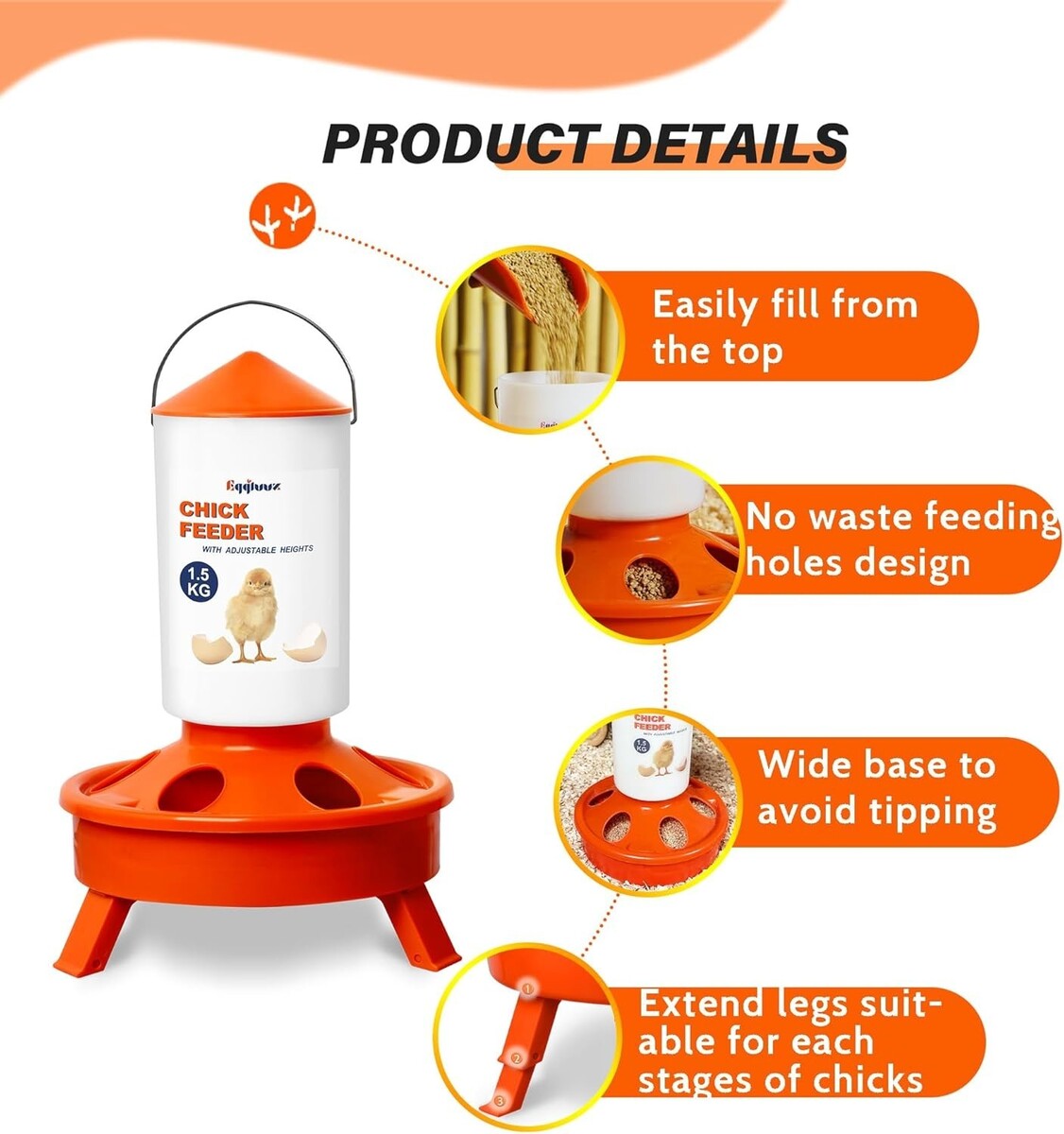 Unique Adjustable Design: Both the feeder and waterer come with 3 easily adjustable legs that can be folded out as your chicks grow, ensuring cleanliness and optimal access to food and water.