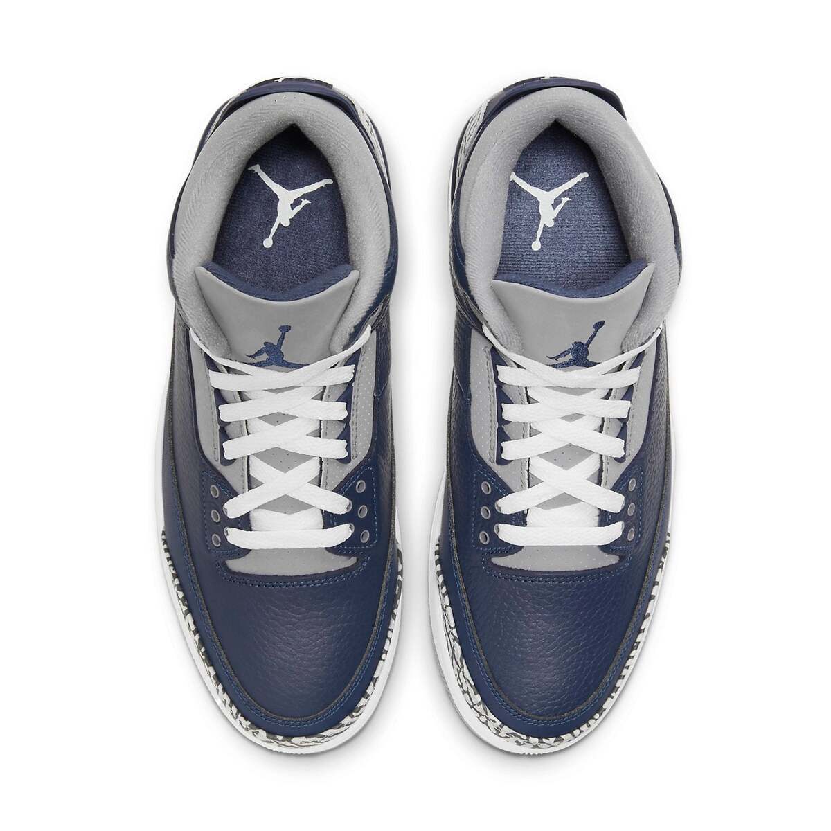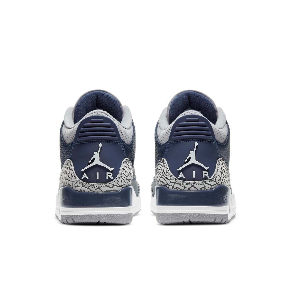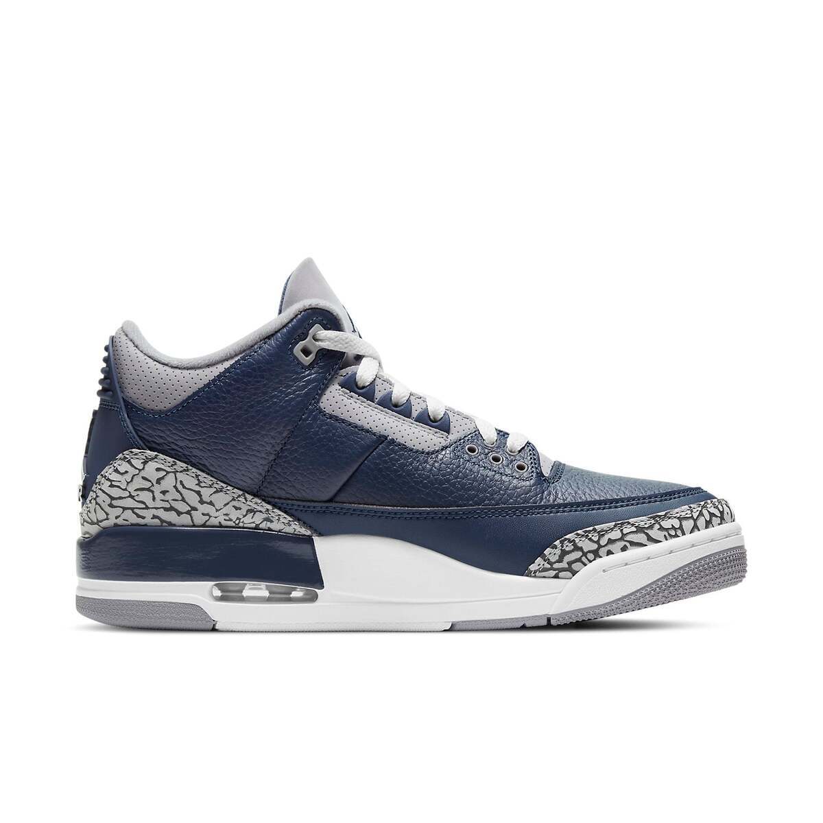 This Air Jordan 3 "George Town" is featured with a Navy color hue accented with grey panels throughout, the uppers here are built from premium quality tumbled leather, with mesh overlays balancing out the design overall. SKU: CT8532-401 Release Date: Mar 20, 2021 Color: MIDNIGHT NAVY/CEMENT GREY/WHITE
