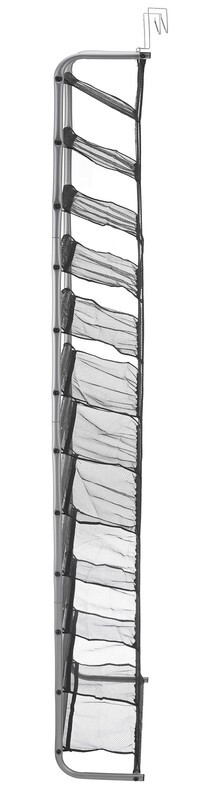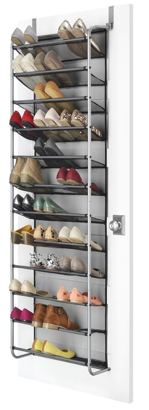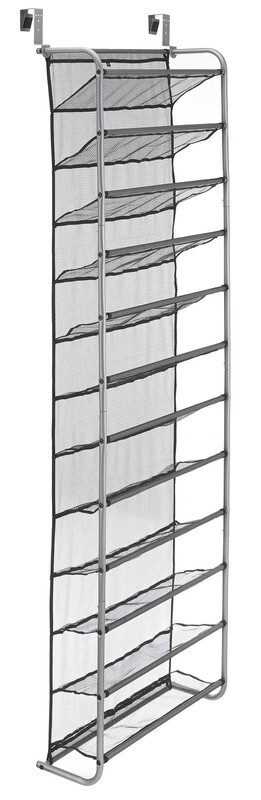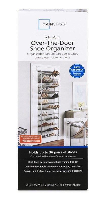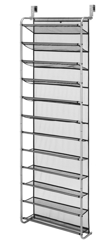 Mainstays 12-Tier over the Door Shoe Rack for 36 Pairs, Metal, Gray This over-the-door shoe rack is made of an epoxy-coated gunmetal frame Mesh-lined back prevents shoes from falling out while also protecting the door from scuffs Unique metal mesh design combination optimizes durability functionality Assembled Dimensions: 7.5 L x 21.625 W x 69.0 H inches Easy assembly with the tools included Stores up to 36 pairs of shoes Made to last, with strong yet breathable fabric and reinforced seams Style# MS89-565-009-05