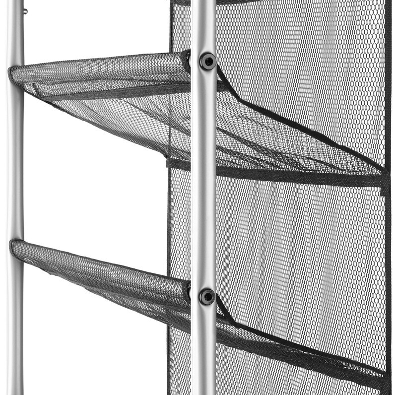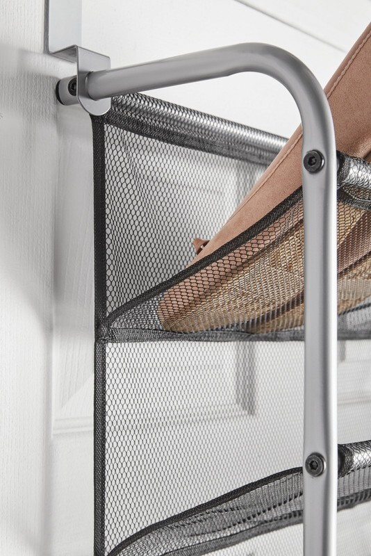 While using that dead space behind your door, Mainstay's 36-Pair Over-The-Door Shoe Organizer holds up to 36 pairs of shoes on display to easily find what you are looking for. The unique metal and tear-resistant mesh design optimize durability and functionality. The mesh-lined back prevents shoes from falling out while protecting the door from scuffs. The adjustable over-the-door hooks accommodate varying door sizes. This shoe rack is made to last, with strong yet breathable fabric and reinforced seams. These elegant shoe shelves are made of a high-quality metal frame with a Gunmetal finish that matches most decor styles. This shoe organizer offers the option to be permanently mounted to a door or wall. (Some assembly is required with the tools included. Assembled Dimensions: 7.5 L x 21.63 W x 69.0 H inches.)