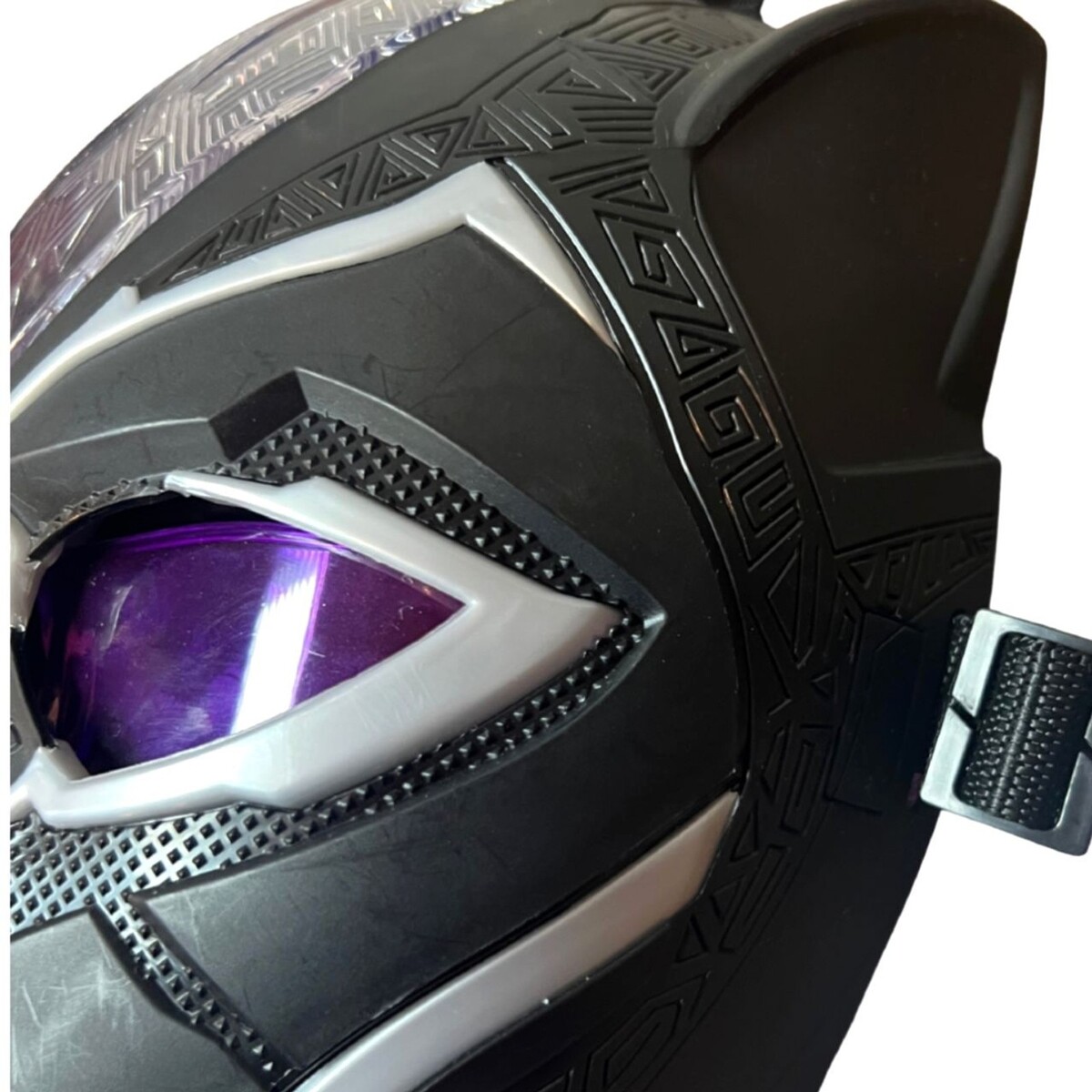 Marvel Black Panther electronic role-play / dress-up / costume mask featuring light-up eyes and an adjustable face shield mechanism. The purple eye shield smoothly opens and closes using the side switch, allowing for display or play. Built-in light feature activates via the side button.