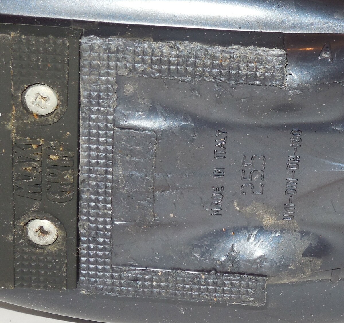 These boots show normal signs of use for pre-owned ski equipment, including scuffs and scratches on the outer shell, consistent with their age. All four buckles are present, intact, and functional. The liners appear to be in good condition, showing typical wear but no significant damage. The "Made in Italy" stamp is visible on the sole, indicating their origin. Please examine all provided photos closely for a detailed assessment of their cosmetic condition.