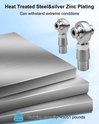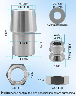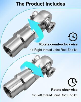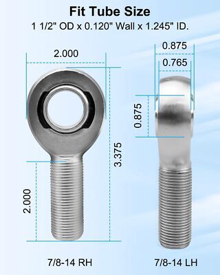 Heavy-duty Material: Heim joint rod end kits are made of heat-treated C1045 steel, silver-zinc plated, precision ground and heat-treated, with a load capacity of up to 45051 pounds, not easy to wear or deform, and can maintain stability under long-term, high-intensity use conditions Product Specifications: Rod end dimensions are 7/8" shaft, 14 TPI, 1.25" ID Tube Adapter, fits tube size: 1 1/2" OD x 0.120" wall x 1.245" ID. Please confirm size specifications before purchasing Wide Application: Suitable for steering and suspension, steering joints, drawbars and linkage joints on modified vehicles, perfect for suspension and steering linkage modifications on trucks, 4x4 off-road vehicles, sand rail vehicles and jeeps, providing excellent handling and stability for the vehicle Easy to Install: Component structure is simple and clear, and can be flexibly adapted to different modification needs by welding or using additional hardware, the included locking nut and bushing assembly ensures that the components are tightly combined, improving the stability and reliability after installation Product Contents: 1 x right-hand thread fitting kit, 1 x left-hand thread heim fitting kit with lock nut and bushing assembly