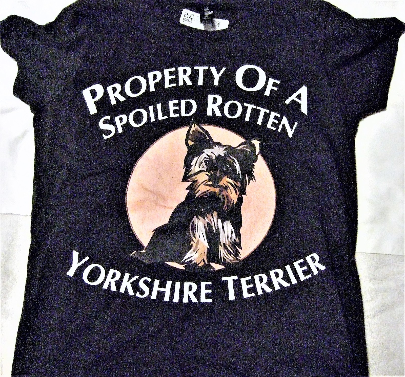 Property Of A Spoiled Rotten Yorkshire Terrier T Shirt. This is a women's Large T Shirt. from Anvil. T shirt has a green background with white and pink lettering. 100% cotton. Makes a perfect gift for any Terrier lover. If you have questions please contact me