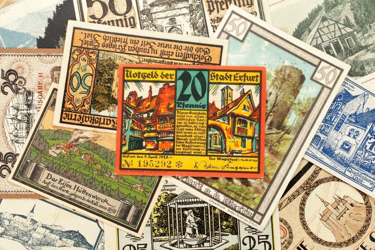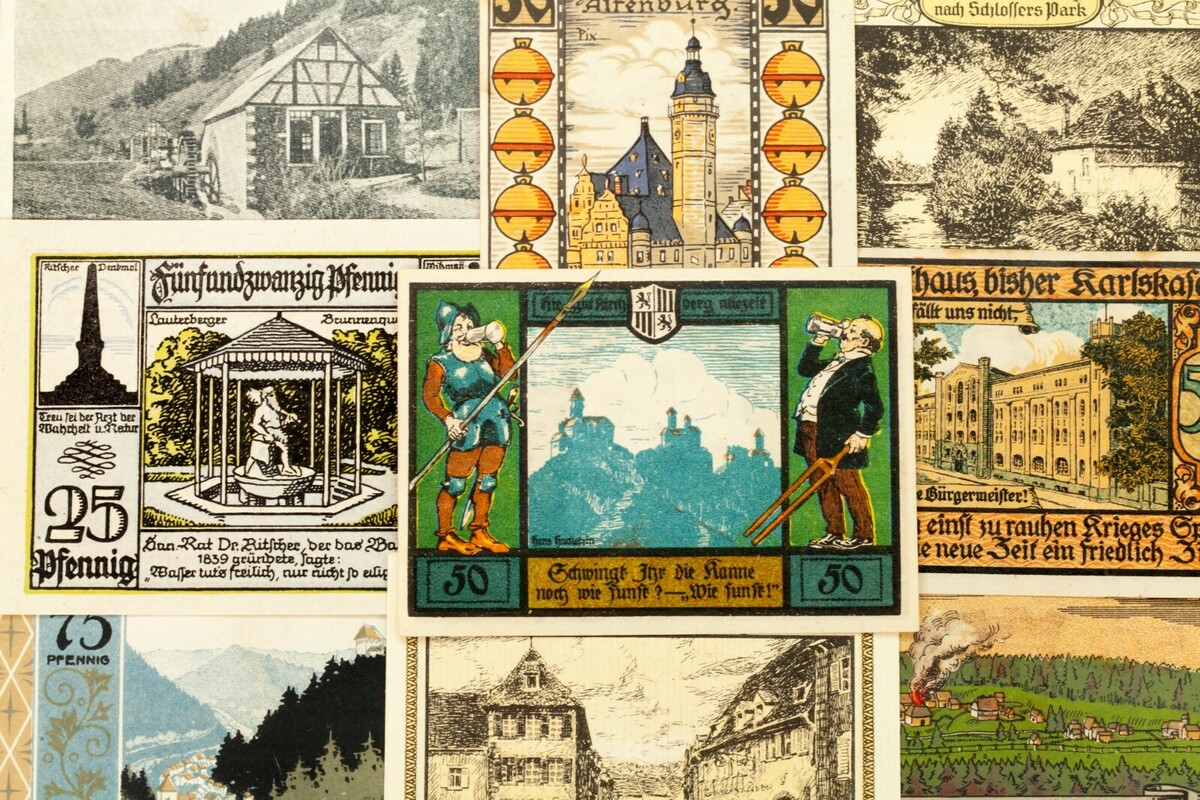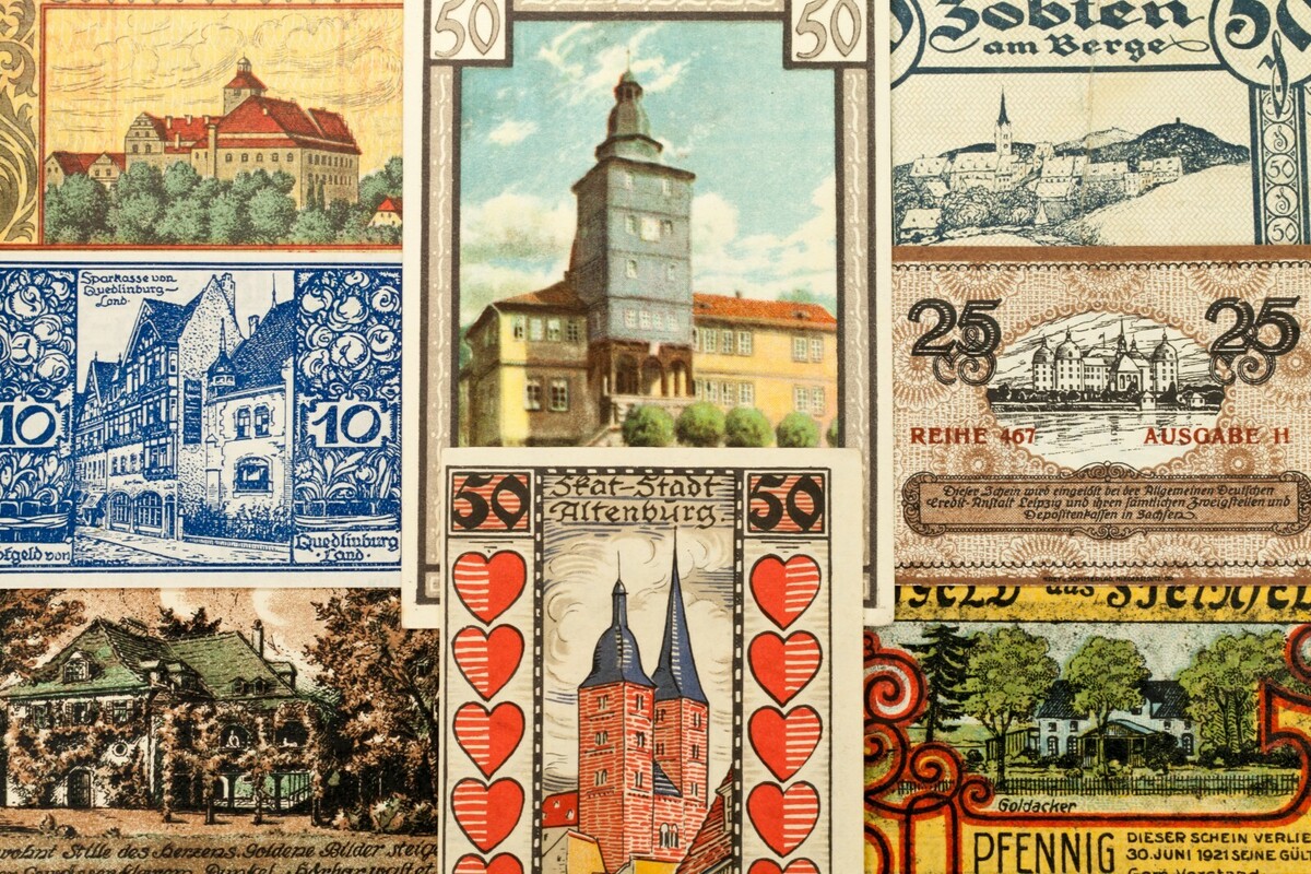 This lot will include 25 individual notgeld notes from Germany after World War I. All will be in Very Fine to Uncirculated (VF-UNC) condition. Face values between 5 pfennig to 5 mark. City views theme; monuments, buildings and landscapes. No duplicates.