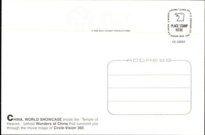 Step back in time to the early days of Epcot Center with this charming vintage postcard featuring the iconic Temple of Heaven from the China World Showcase pavilion. This original 1982 Walt Disney Productions postcard showcases the stunning architecture and tranquil beauty of one of Epcot's most beloved international destinations.