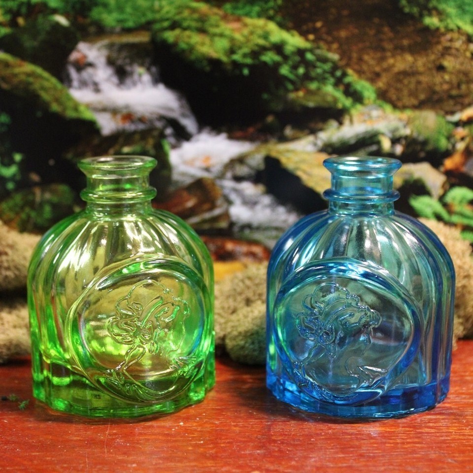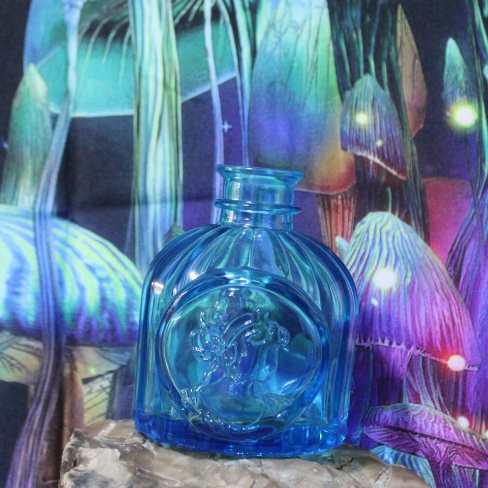 Mini Light Blue Colored Glass Round Lady in a Bottle Vintage Style Jar H =3.25in