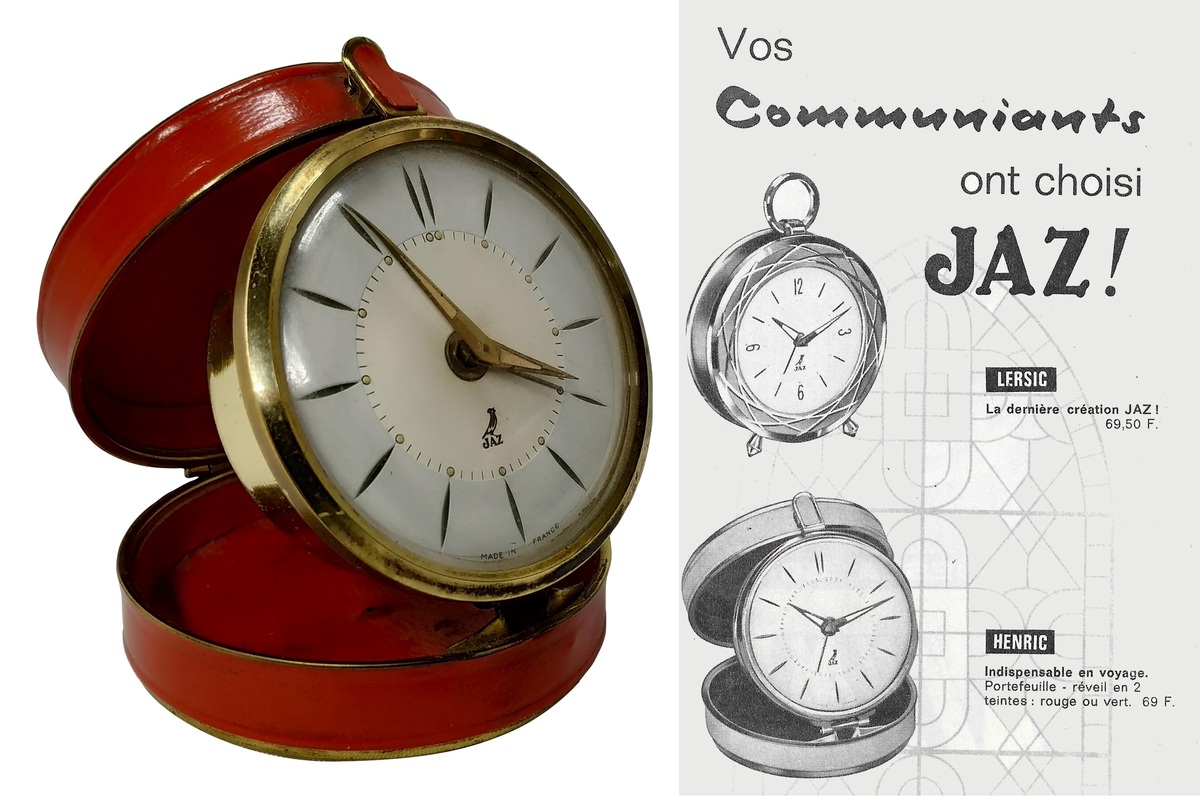 Step back in time with this exquisite piece of French horological history. This is the JAZ "Henric" travel alarm clock, a classic "Portefeuille" (wallet-style) timepiece produced in France during the late 1950s to early 1960s.