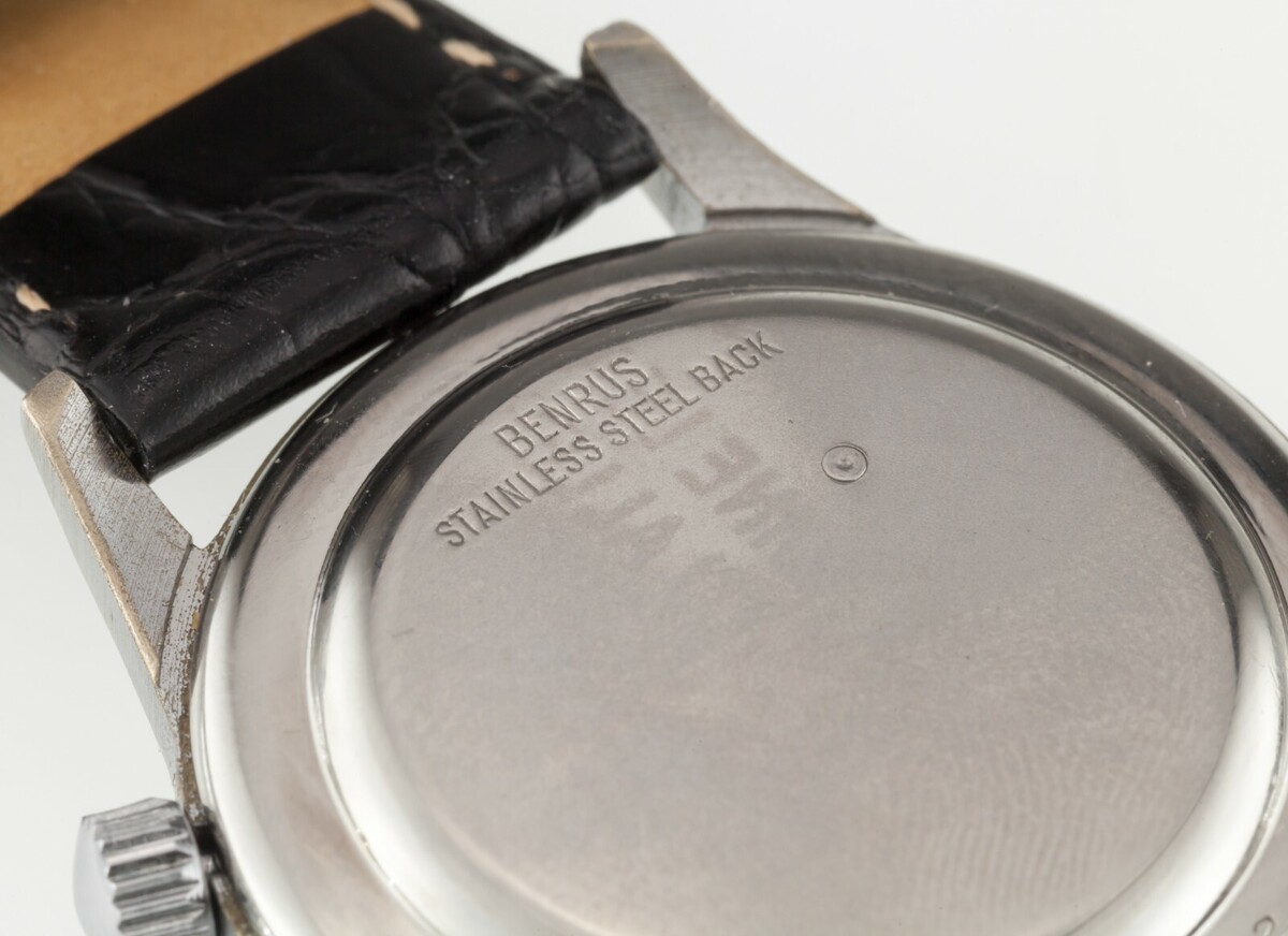 Benrus Homme Acier Inoxydable Poignet Alarme Mecanique Montre W/ Cuir Bande