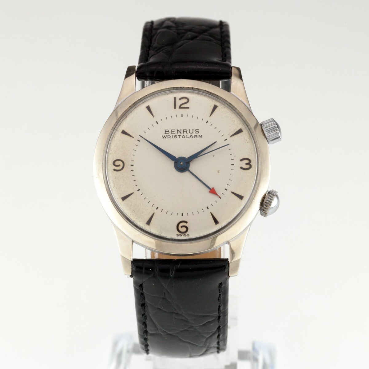 Benrus Montre mecanique pour homme en acier inoxydable avec alarme et bracelet en cuir