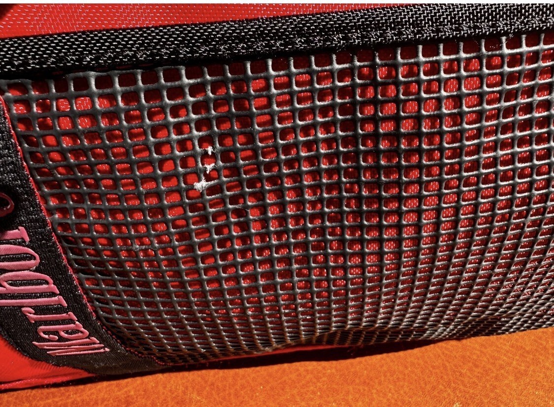 In overall good condition. Note that there is a small lock on the zipper (does not impact use) and some light black spots on bottom (see photo)