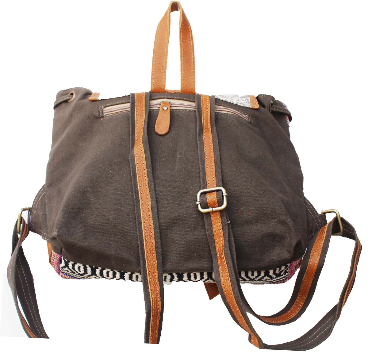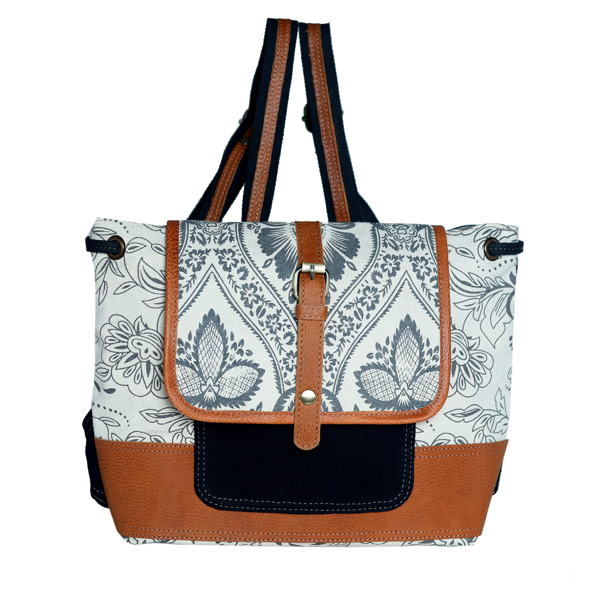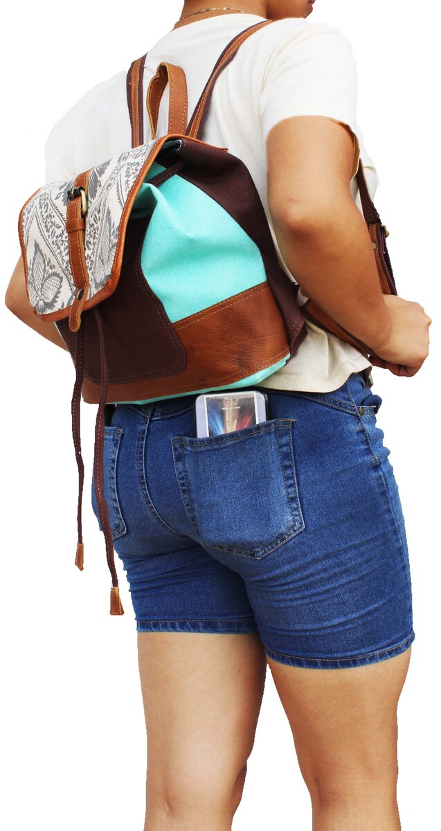 Challenger women's backpack made from fabric, upcycled canvas, and tan pebbled leather. Bag is uniquely accented with a beautiful two-tone southwest design, and a floral printed accent. This practical, lightweight, and conveniently sized roomy bag is made sturdy to endure everyday use. Perfect choice for school, work, travel, or weekend trips. Main compartment has a button closure with a drawstring that ensures your belonging are kept secure, while also offering a wide opening to easily access your belongings. The fully lined interior also features a side zippered pocket, and two open pockets for additional storage. On the outside you have an open compartment in the front, and a zippered pocket on the backside. The antique finish brass hardware nicely ties the bag together. Bag measures 14.5" L x 10" H providing plenty of room for all of your everyday essentials.