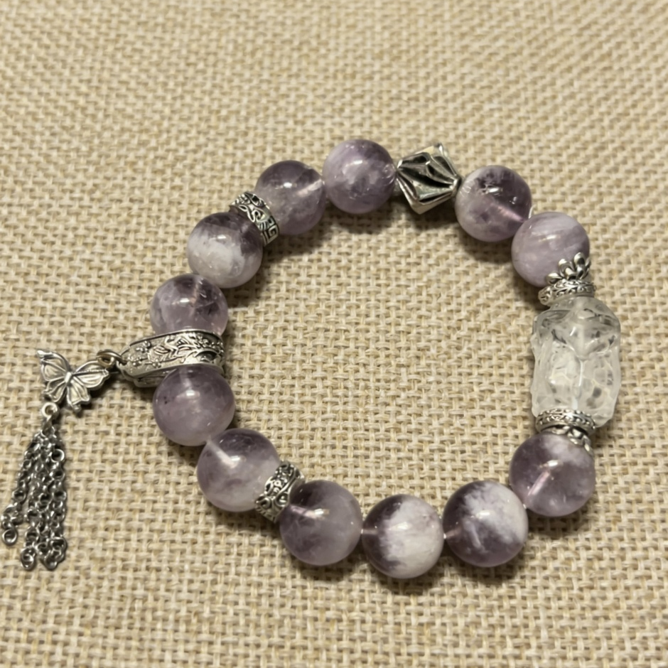 ? About This Bracelet A beautifully crafted bracelet featuring natural 14mm Lavender Amethyst beads with a hand-carved Clear Quartz Dzakri Lhamo deity charm (14mm 22mm). Decorated with intricate silver-toned spacers, a diamond-shaped accent bead, and a delicate butterfly tassel charm — a meaningful piece that blends Eastern spirituality with elegant jewelry design.