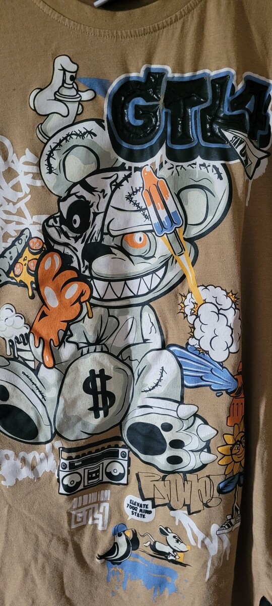 GTL4 Men's T-Shirt Size Large Good Things Last Brown Psycho Bear Money Bag Cute