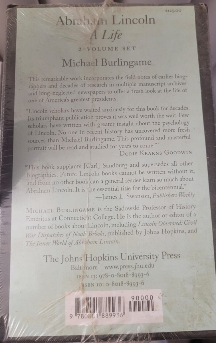 2. ABRAHAM LINCOLN: A LIFE, 2 Volumes. If there is a "magnum opus" in the field of Lincoln studies, this set is it. This gorgeous 2-Volume hardback set, is still in its original box covered in the original plastic, as it has never been opened. Published by Johns Hopkins in 2008, this tome was written by one of the deans of Lincoln scholarship, Michael Burlingame. This set has supplanted the books that preceded it (and I daresay superseded the ones that came after) due to the depth and breadth of the scholarship.