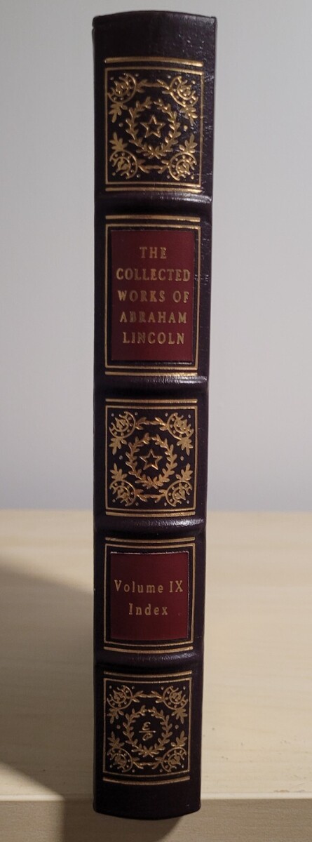 1. THE COLLECTED WORKS OF ABRAHAM LINCOLN, 11 Volumes. Produced by Rutgers University Press in 1988, this second printing is simply stunning. The blue hardback cover, embossed with silver printing, is in NEW CONDITION. There are many Collected Work sets out there, most having been printed in 1953, but I have yet to find this particular set on the open market. It is an 11-volume set, but unfortunately, it is missing Volume 9, which happens to be the index. It has been replaced with the upgraded, gorgeous index from Easton Press, which was published in 1993. As an extra added inducement, this set also contains the two, very rare, First and Second Supplements, which were compiled after the set had gone to press. Truly a set to pass down through the generations.
