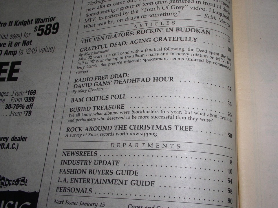 This is the December 18, 1987 issue of "BAM" magazine. Cover story on The Grateful Dead. Inside: The Ventilators, David Gans' Deadhead Hour, Buried Treasure, Rock Around The Christmas Tree. A terrific item for the fan or collector.