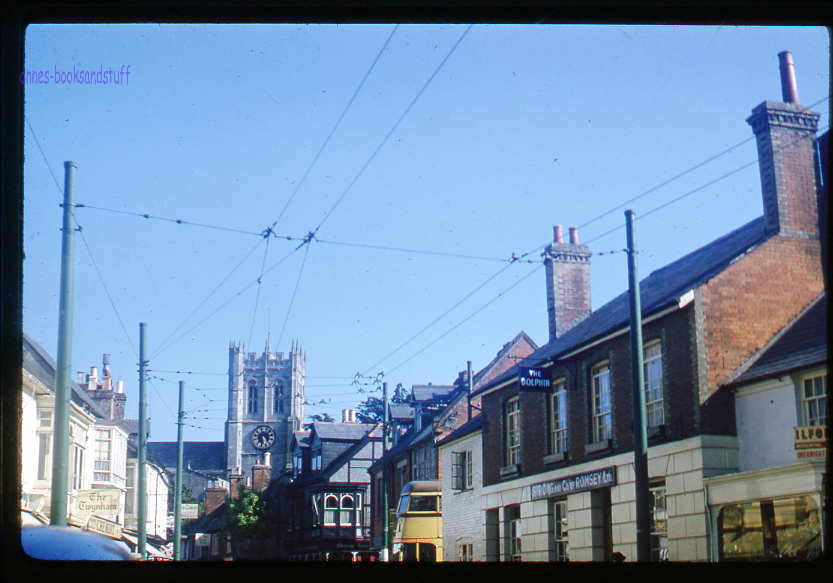 35 mm color slide * 1950's travel to England Christchurch main st. signs dolphin