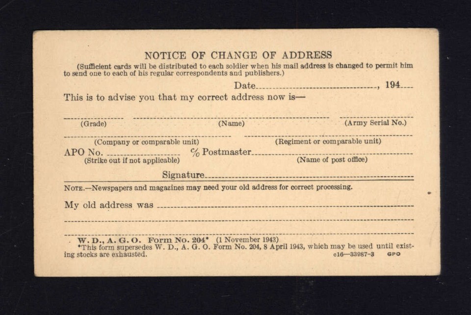 1943 WAR DEPARTMENT - NOTICE of CHANGE of ADDRESS not filled out details scanned