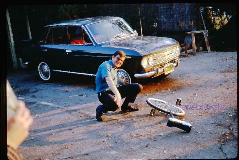 35 mm color slide * March 1968 DATSUN CAR - Man fell off UNICYCLE getting up